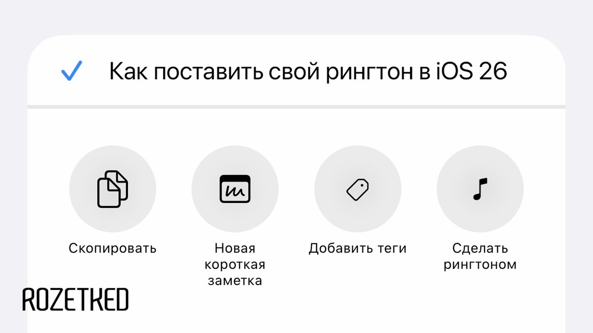 Позвони-ка мне — послушаешь, что на звонке стоит Эта фраза осталась где-то в нулевых для всех, кроме Apple — в iOS 26 появилась простая установка рингтонов. Теперь на iPhone можно поставить любую мелодию на звонок без GarageBand, Mac и других танцев с бубном. Всё, что нужно сделать, это скачать аудиофайл длиной до 30 секунд, найти его в «Файлах» и нажать на заветную «Сделать рингтоном». Ну теперь точно revolution. Инструкция: rozetked.me/articles/40171