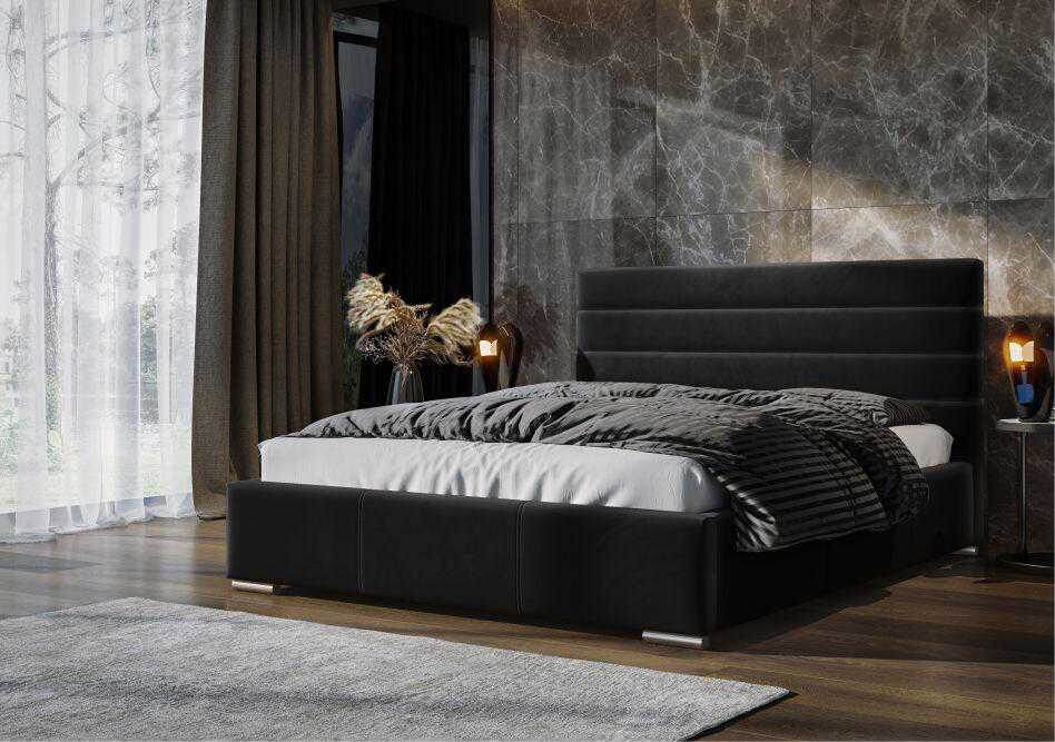 Красивая спинка-изголовье, основательный каркас, решетчатая конструкция ортопедического основания, вместительный бельевой ящик.
