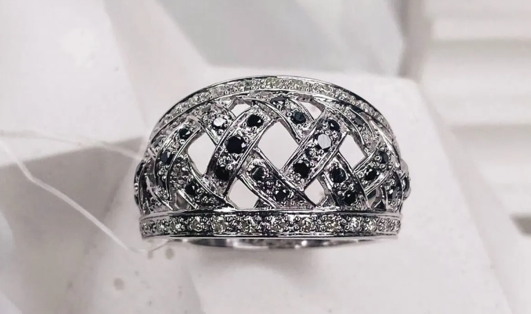 Изделие выполнено из белого золота 585 пробы. Оно привлекает внимание своим интересным дизайном: ажурная плетеная структура, в которой чередуются дорожки черных и белых бриллиантов. Такое контрастное сочетание смотрится очень выигрышно и гармонично. Камни круглой огранки создают красивый блеск и игру света.