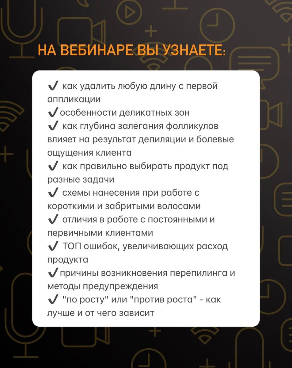 Ваш любимый формат — живой мастер-класс на модели + подробный разбор самых частых ситуаций из практики мастеров. ⠀ Приглашаем на практический вебинар: 📍 18 июля в 11:00 по МСК «Бикини с первой аппликации: секретные техники для максимального результата» За 2,5 часа вы узнаете: ✅ как удалить любую длину с первой аппликации ✅ особенности деликатных зон ✅ как глубина залегания фолликулов влияет на результат депиляции и болевые ощущения клиента ✅ как правильно выбирать продукт под разные задачи ✅ схемы нанесения при работе с короткими и забритыми волосами ✅ отличия в работе с постоянными и первичными клиентами ✅ ТОП ошибок, увеличивающих расход продукта ✅ причины возникновения перепилинга и методы предупреждения ✅ "по росту" или "против роста" - как лучше и от чего зависит 🎁 Бонус для участников — специальные условия на покупку продукции DEPIMAX PROFESSIONAL 💬 Спикер вебинара — Елена Кулакова - руководитель технологического сервиса ООО «Косметик Сервис» России и ЕАЭС. Тренер-технолог