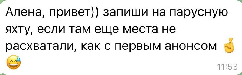 Девочки,места на яхту опять стремительно таят,успевайте занять свое❤️🔥 Анонс: https://dzen.ru/media/kulturnyidevichnik/anons-devichnik-na-parusnoi-iahte-katamaranepovtor-6872bfd443a13343294bb95f Запись через @devishnik_spb