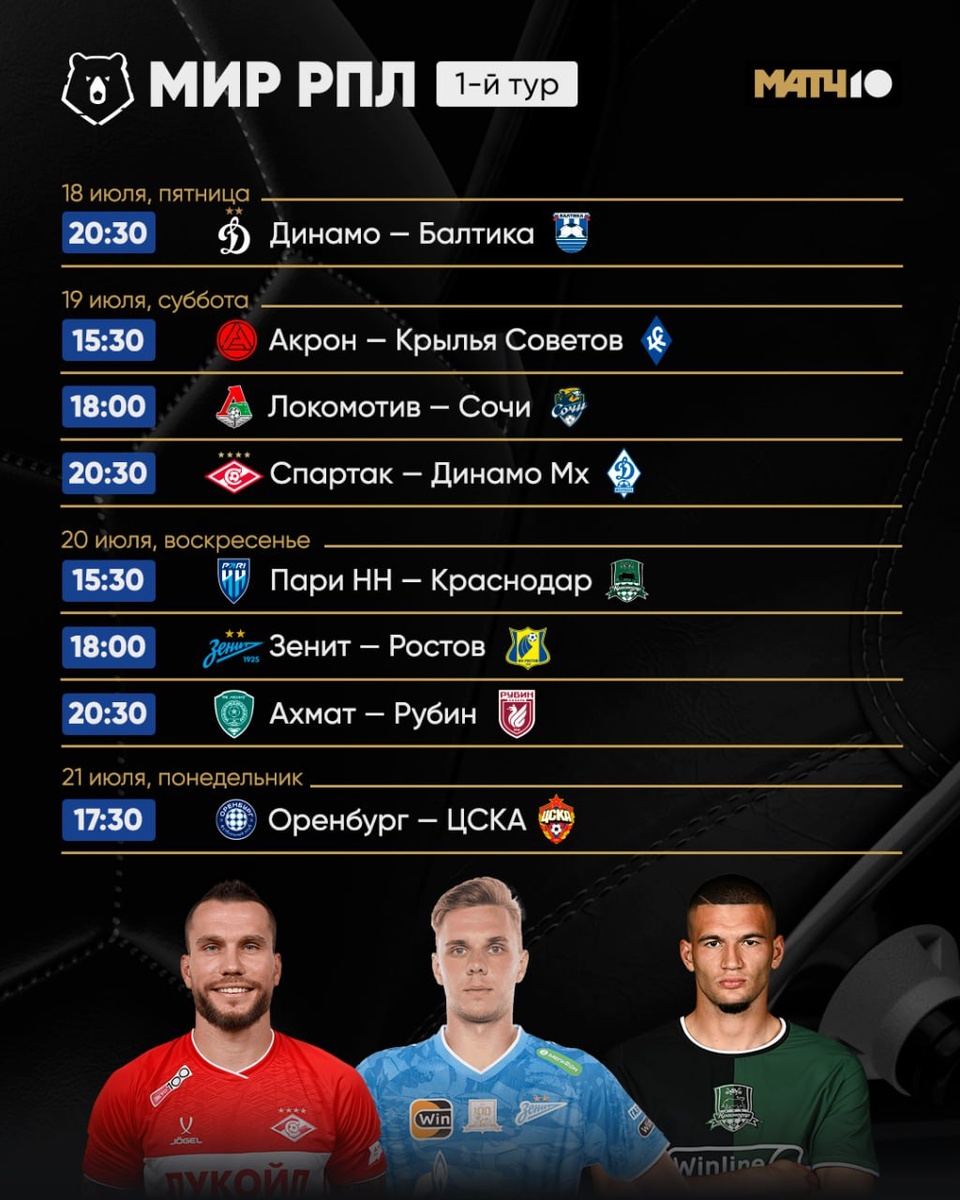 Старт нового сезона РПЛ: Расписание и главные интриги первого тура Футбольная Россия замерла в предвкушении! Совсем скоро, уже на этой неделе, стартует новый сезон РПЛ. Первый тур обещает настоящий футбольный праздник с матчами по всей стране. Давайте взглянем на расписание и выделим ключевые поединки. Открытие сезона: Динамо Москва принимает новичка Пятница, 19 июля: Интриги в регионах и столице Суббота, 20 июля: Борьба по всем фронтам Воскресенье, 21 июля: Завершение тура с армейским дерби Где смотреть? Все матчи тура будут доступны в прямом эфире телеканалов "Матч!" И "МатчПремьер" Интрига нового сезона начинается прямо сейчас! Какая команда задаст тон? Кто станет открытием тура? Где ждать сенсации? Ответы – на футбольных полях России уже в эти выходные! Время готовиться к просмотру и болеть за своих!