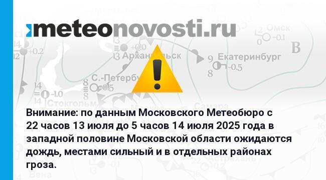 Внимание: по данным Московского Метеобюро c 22 часов 13 июля до 5 часов 14 июля 2025 года в западной половине Московской области ожидаются