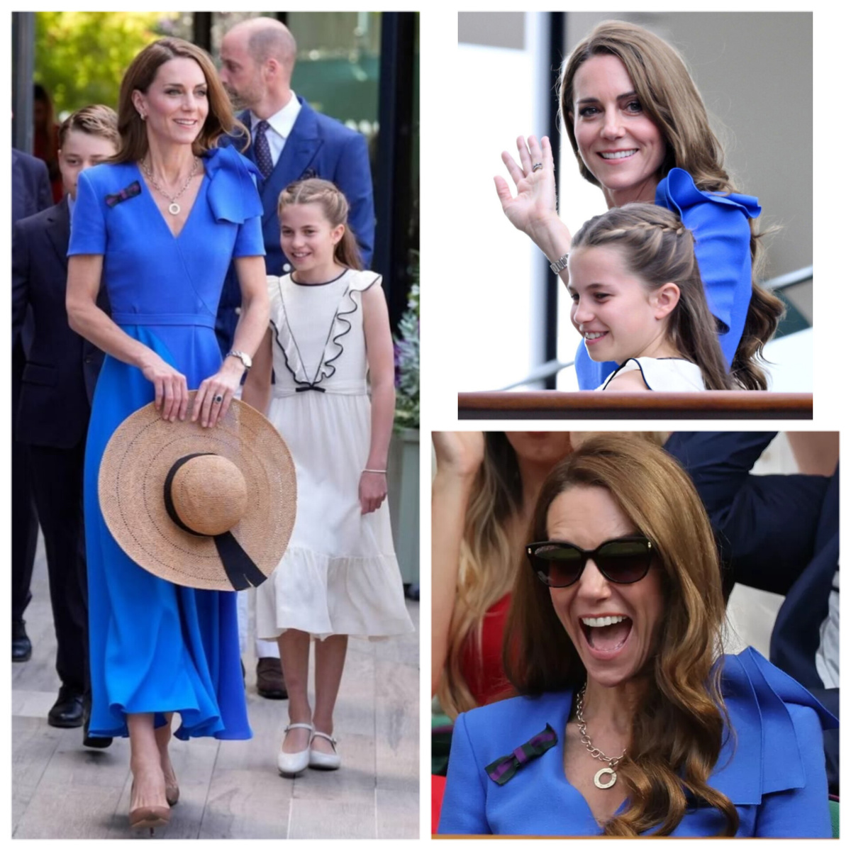 Сегодня Кэтрин вновь посетила Уимблдон, побывав на мужском финале вместе со своим мужем и детьми. Ранее Кенсингтонский дворец подтвердил присутствие на спортивном мероприятии принца и принцессы Уэльских, и публика надеялась, что наследное семейство приведет с собой на корт и своих детей. Однако на Уимблдон взяли только Джорджа и Шарлотту, - семилетний Луи остался дома, так и не посетив теннисные соревнования ни разу. Сегодня Кейт выбрала королевский синий цвет, появившись в элегантном платье с брошью в виде фиолетово-зеленого банта, который еще называют "Уимблдонский бант". Эта брошь как знак королевского покровительства была подарена супруге Уильяма королевой Елизаветой, и Кейт дебютировала с ней в 2017 году. С тех пор принцесса надевает ее каждый раз, когда посещает Уимблдон. Юная Шарлотта также была признана "украшением турнира", покорив зрителей соревнований своей улыбкой и жестами приветствия. На принцессе было белое платье миди с рюшами. Единственная дочь Уэльских уже