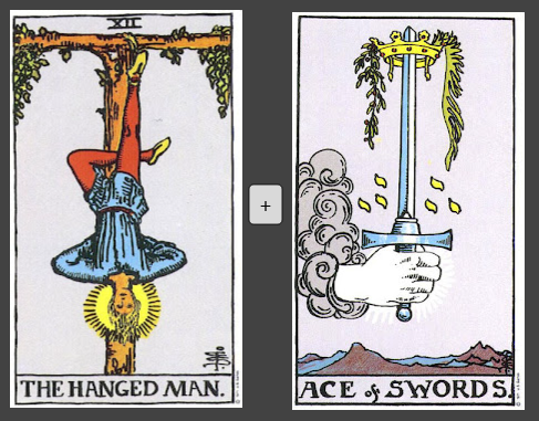Что может означать сочетание карт Повешенный и Туз мечей в позиции мыслей человека