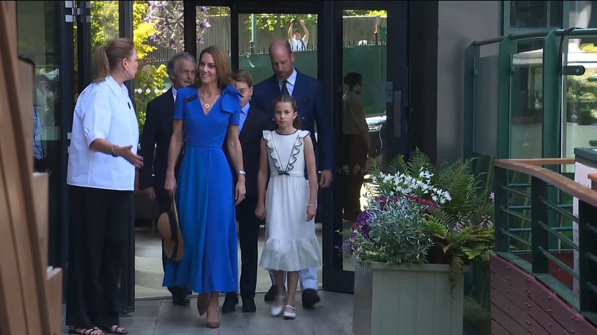Принц Уильям и принцесса Кэтрин сегодня преподнесли настоящий сюрприз своим поклонникам: они прибыли на мужской финал Уимблдона вместе со старшими детьми: Джорджем и Шарлоттой. Луи видимо ещё не дорос до таких мероприятий 😊 Сегодня матч между Карлосом Алькарасом и Яником Синнером. За испанца сегодня болеет его король - Филипп, он тоже на трибунах. Кэтрин выбрала сегодня платье королевского синего цвета. Уильям надел синий пиджак. У Джорджа - костюм оттенком потемнее. А вот Шарлотта - в белом платье с рюшками. Но бантик на косичках - синенький Кэтрин - с 2016 года является покровительницей Всеанглийского клуба лаун-тенниса и крокета, также известного как AELTC (который организует повседневную работу престижного турнира). Уильям поддерживает Джорджа: Сначала Уэльские поговорили с со Стивом Бэкшоллом, британским натуралистом, ведущим телепрограмм. Рукопожатия с организаторами: Ожерелье принцессы Уэльской от Даниэллы Дрейпер с цепочкой ручной работы (подтверждено брендом).: В