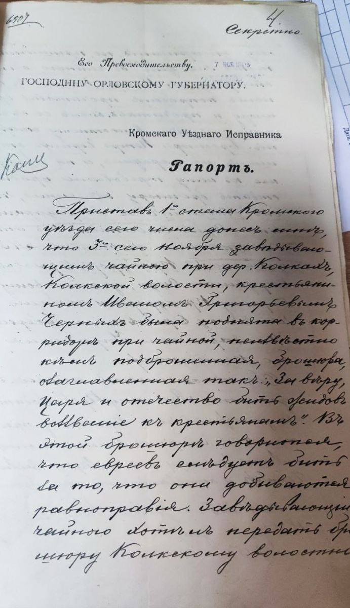 "Пристав 1-го стана Кромского уезда сего числа донес мне. Что 3 ноября заведующий чайной при дер. Колках Колкской волости, крестьянином Иваном Григорьевичем Черных была поднята в коридоре при чайной неизвестно кем подброшенная брошюра, озаглавленная так: «За веру, царя и Отечество бить жидов, воззвание к крестьянам». В этой брошюре говорится, что евреев следует бить за то, что они добиваются равноправия. Заведующий чайной хотел передать брошюру Колкскому волостному старшине, но пришедший в чайную сын старшины Петр Васильев Черных попросил прочитать брошюру и прочитав, взял ее с собой для передачи волостному старшине. Брошюры Петр Черных старшине не передал, а на обращенные к нему требования урядника отдать брошюру объяснил, что он отослал ее в редакцию газеты «Сын Отечества». Об этом происшествии донесено прокурору Орловского окружного суда, участковому товарищу прокурора и сообщено начальнику Орловского губернского жандармского управления и его помощнику.