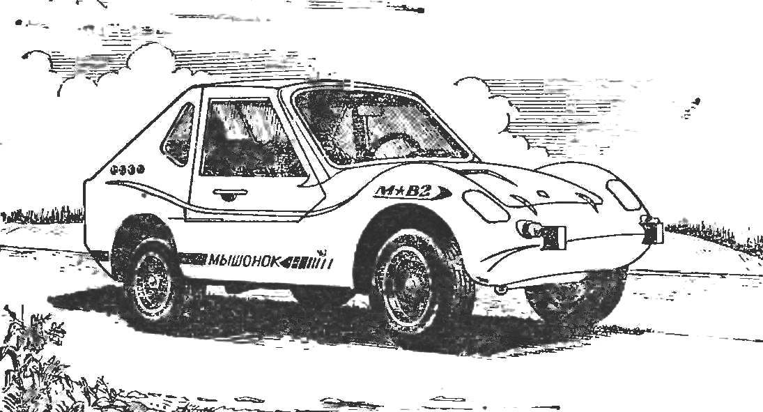 Первый микроавтомобиль «Мышонок» я построил для моих детей. В результате я накопил некоторый опыт конструирования и задумал уже не детскую, а «взрослую» машину — для себя. Назвал ее «Мышонок-2». Строил долго, вернее, не столько строил, сколько искал необходимые детали, узлы. Этим, в частности, объясняется применение в «Мышонке-2» механических тормозов (сейчас я меняю их на гидравлические). Разработка чертежей и постройка велись одновременно, хотя основные параметры «Мышонка-2» были продуманы мною заранее.