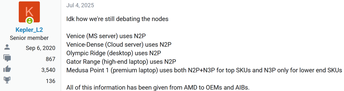 Компания AMD, по всей видимости, поделилась с партнёрами информацией об используемых техпроцессах архитектур процессоров следующего поколения. Новая серия снова будет охватывать серверные, настольные и мобильные платформы. Инсайдер, имеющий хорошую репутацию в области конфиденциальных планов AMD, подтвердил, что новая серия будет в первую очередь использовать техпроцесс N2P, хотя некоторые продукты также будут использовать техпроцесс N3P. По данным инсайдера Kepler_L2, процессоры EPYC Venice Classic и Venice Dense будут использовать N2P. Предположительно, это касается ядер чиплета, число которых, как теперь известно, увеличится до 12 (Classic) и даже 32 (Dense) на кристалл. Olympic Ridge, кодовое название процессоров Ryzen следующего поколения (возможно, серия 10000), также будет использовать этот техпроцесс. Процессоры AMD на архитектуре Zen6: • Venice: N2P → серверы; • Venice-Dense: N2P → облачные серверы; • Olympic Ridge: N2P → настольные компьютеры; • Gator Range: N2P → ноутбуки вы