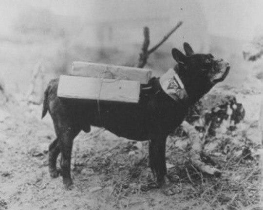 Французский бульдог из американского 11-го инженерного батальона разносит сигареты своим товарищам на передовой, 1918 год.