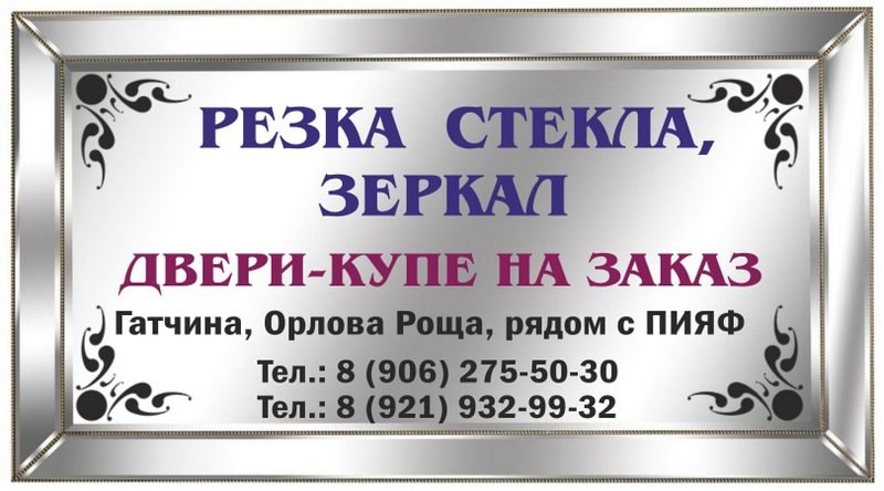 РЕЗКА СТЕКЛА И ЗЕРКАЛ в Гатчине и районе. Двери-купе на заказ. Стекольная мастерская предлагает стёкла и зеркала: - Оконное (4 мм) - Витринное (5, 6 мм) - Узорчатое стекло разных оттенков - Матовое, бронза - Зеркало 4 мм - Обработка кромки, сверление отверстий - Нанесение пескоструйного рисунка - Наклейка защитной пленки на зеркала для шкафов-купе - Наклеивание цветной пленки Oracal на стекло - Каленое стекло - ДВЕРИ-КУПЕ НА ЗАКАЗ Ленинградская область, г. Гатчина, Орлова роща, 3. Тел.: 8 (906) 275-50-30 Тел.: 8 (921) 932-99-32 На телефонах работает Ватсапп! Группа ВКонтаке: vk.com/steklo_gatchina Email: 9329932@rambler.ru Часы работы с 10:00 до 18:00, без обеда. Суббота и воскресенье - выходные. При получении заказа, необходимо уточнить его готовность по телефону. Для юр. лиц и ИП отгрузка осуществляется при наличии печати или доверенности. В Интернете (в поисковиках) нас находят, в частности, по таким словам: зеркало Гатчина, стекло Гатчина. #зеркалоГатчина #стеклоГатчина #Гатчин