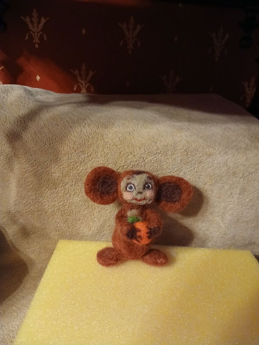 Добрый день всем, дорогие друзья! Вам, без сомнения, знакомы слова этой песенки: "Я был когда- то странной игрушкой безымянной/ К которой в магазине никто не подходил..." Сейчас эта игрушка стала очень популярной во многих странах. Можно сказать без преувеличения, её знают и любят во всём мире, а у нас в стране тем более. Это всё я вам напомнила по причине того, что задумала на Новый год традиционно сделать всем друзьям и родным в подарок игрушки на ёлку. На этот раз я буду ваять всем знакомого Чебурашку. Первый экземпляр, он же пробный получился у меня вот такой: У него личико получилось темнее, чем мне бы хотелось. Значит, надо взять шерсть другого цвета. Взяла оттенок, более похожий на телесный. Второй Чебурашка получился такой: На фото почему- то глазки получаются выпученные, хотя в реальности совсем не так смотрятся. Посмотрела я на этих двух парнишек и решила, раз есть темнокожий и белокожий Чебурашка, почему бы не быть их желтокожему братцу. Сказано- сделано. Вот и явился на све