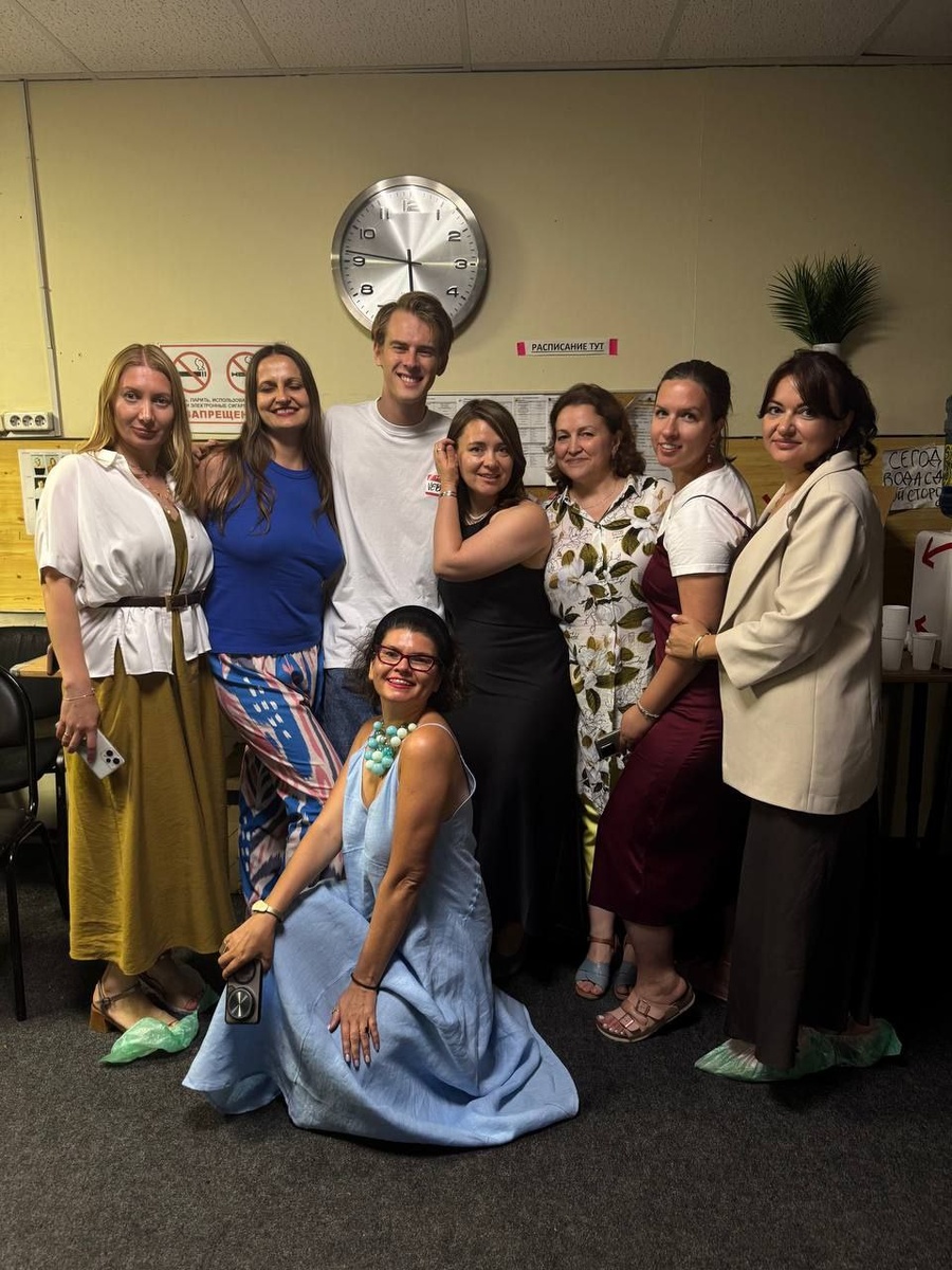Так, ну дальше все пошло, как и задумывалось! Как только закончился мюзикл специально для нас открылась красная кулиса и шампанское всём! А потом к нам пришел актер, исполнитель главной роли, Никита Шишкин и... повел снова в зал. Где все было только для нас. Открыл все тайны закулисья, рассказал, как это все работает, играет и летает. Провел весёлый актерский тренинг и поздравил наших именниц с днём рождения. Да-да, были те, кто пришли сегодня праздновать свои ДР с нами. Девочки, ещё раз поздравляю. Кажется, это было очень трогательно ❤️ и весело.и познавательно! 10 августа повторим! И это, пару мест есть, пишите сюда👇 @IrinaPolezhaeva