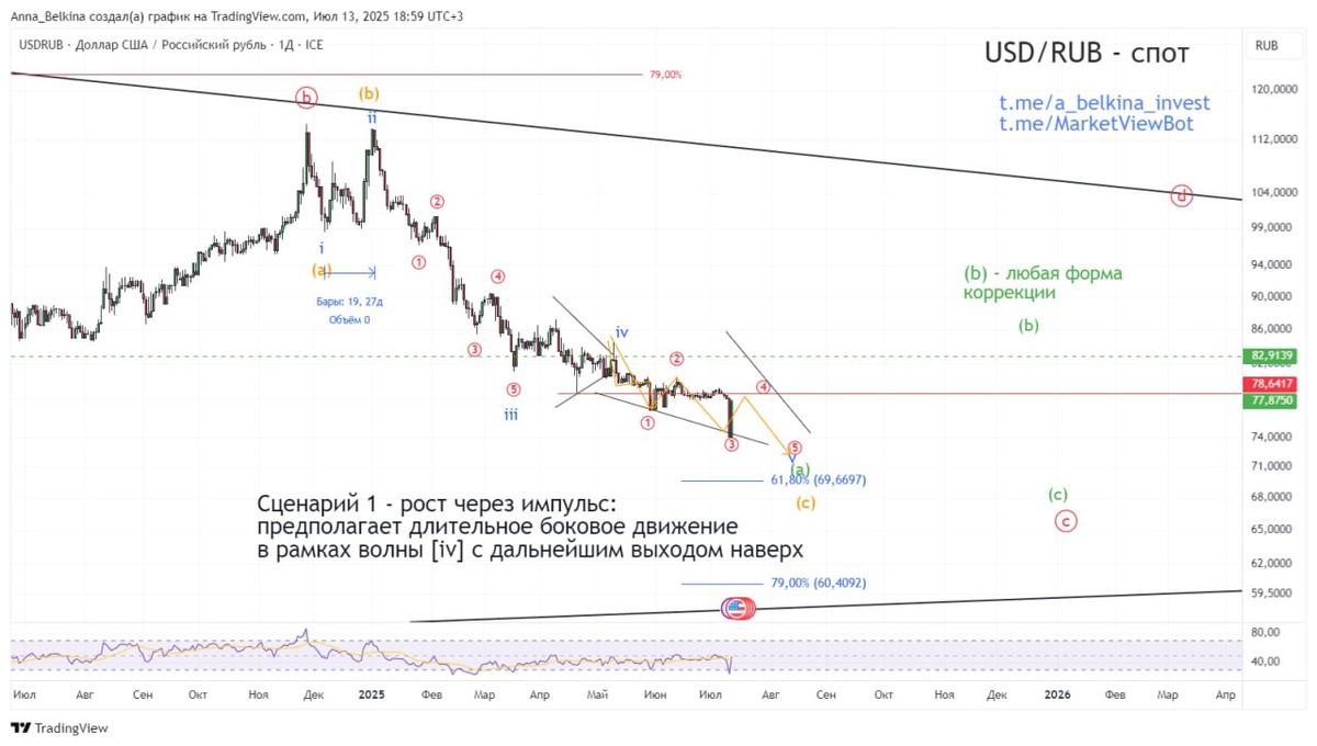 #USDRUB Пока без изменений, российский рубль продолжает укрепляться против доллара. Для завершения структуры конечной диагонали в волне v of (a) of [c] не хватает как минимум еще одного низа при условии отсутствия усложнений в КД. Не является ИИР 💪 Бот Закрытого Канала