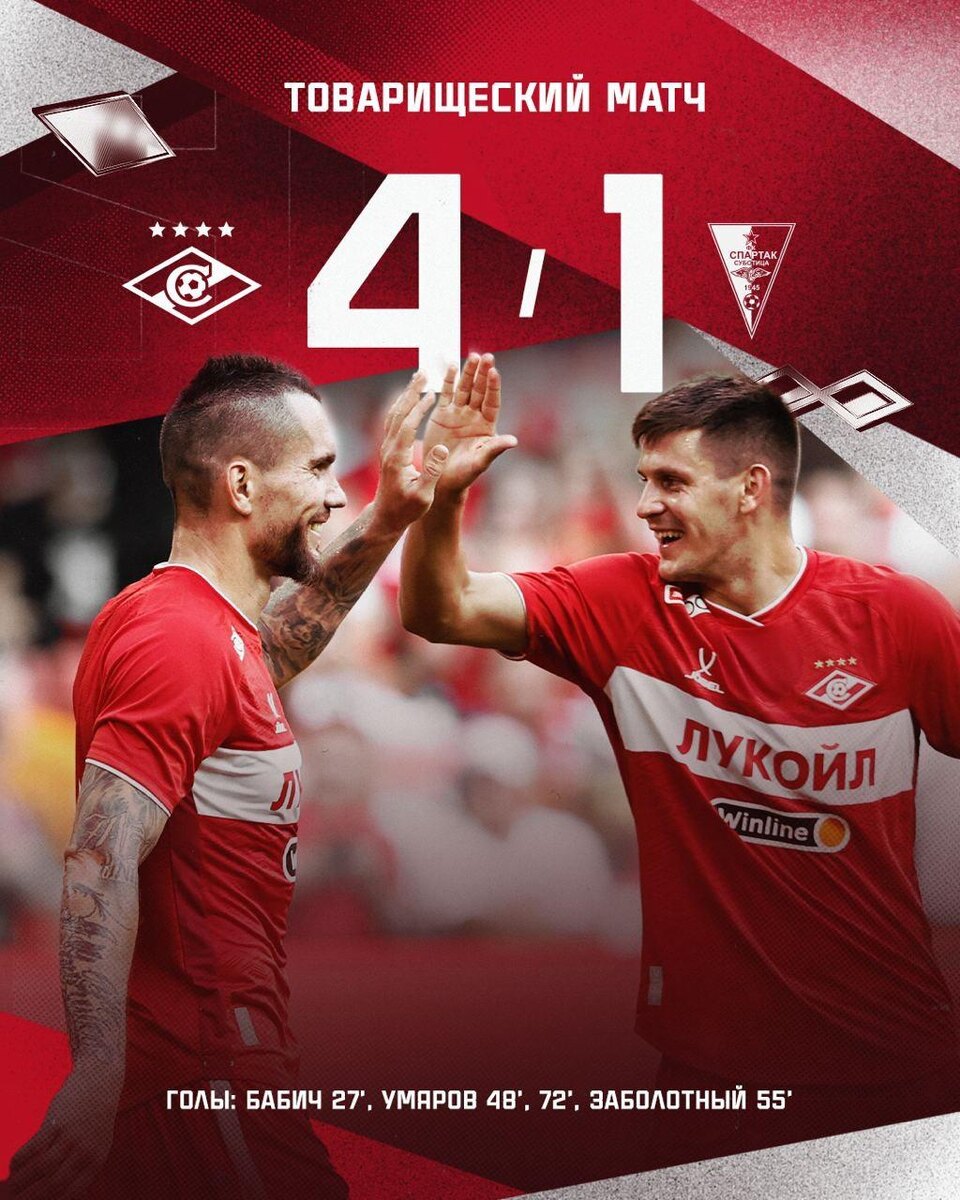 ♦️ «Спартак» победил «Спартак»: красно-белые выиграли товарищеский матч Подопечные Деяна Станковича на своём поле разгромили одноимённую команду из сербской Суботицы — 4:1. Счёт в матче открыли гости: на 23-й минуте отличился Кваку Бонсу Осеи. Вскоре Срджан Бабич сравнял счёт, а после перерыва поражали ворота только москвичи. Победный дубль оформил Наиль Умяров, также дебютный гол в составе десятикратных чемпионов России забил Антон Заболотный. @russian_rt_sport