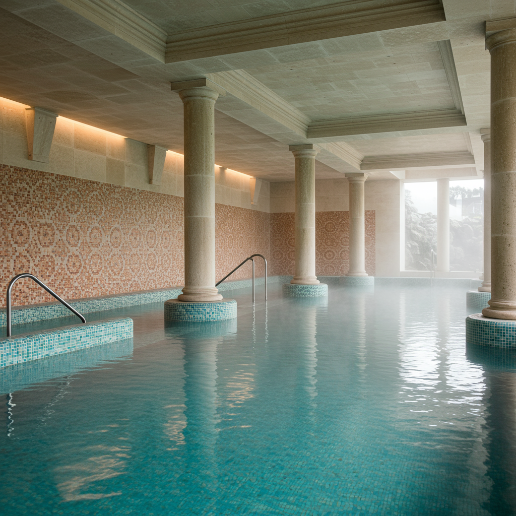 - Южноевропейские термы: изысканная керамическая плитка с орнаментами, открытые террасы, гармоничная интеграция с историческими зданиями
