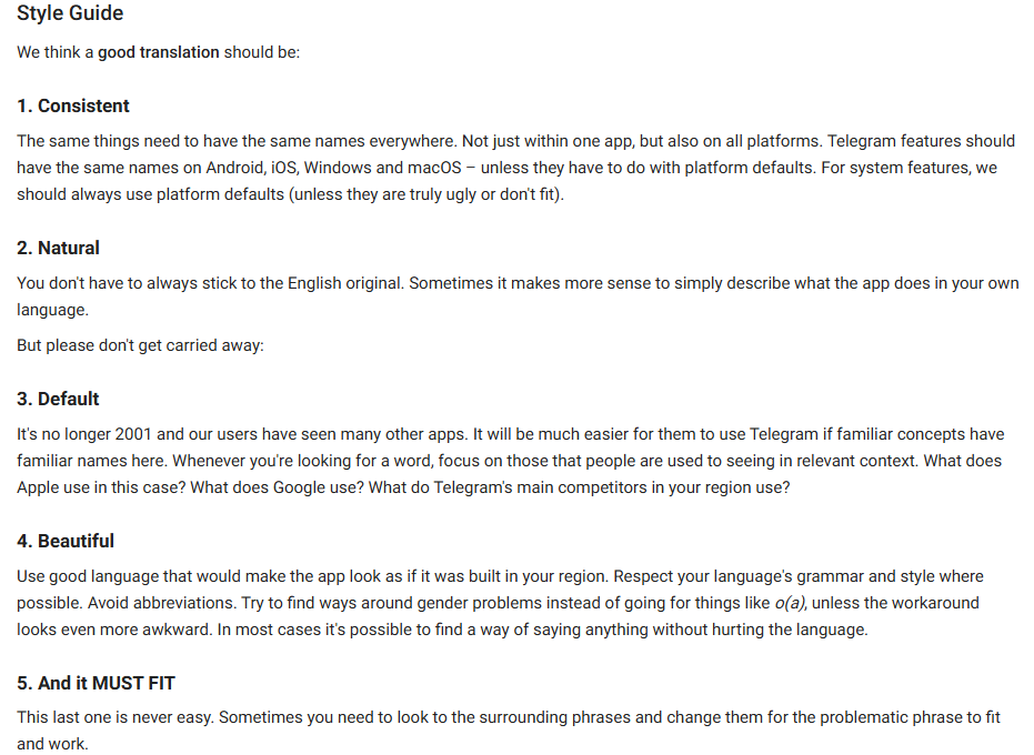 Одинаковые функции и элементы должны называться одинаково на всех платформах (Android, iOS, Desktop, macOS, Web). Перевод должен быть интуитивно понятным, даже если он сильно отличается от оригинала. Используйте термины и фразы, которые уже знакомы пользователям из других приложений. Ваш перевод должен помещаться в отведенное для него пространство в интерфейсе. Избегайте переносов слов или обрезки текста. Чистота текста: нет орфографических и грамматических ошибок, единая стилистика на протяжении всего языка (например, уровень формальности), по возможности, используйте гендерно нейтральные выражения. Избегайте лишних пробелов в начале и конце строк. Минимизируйте использование переносов строк (\n) внутри фраз, если они не предусмотрены оригиналом.