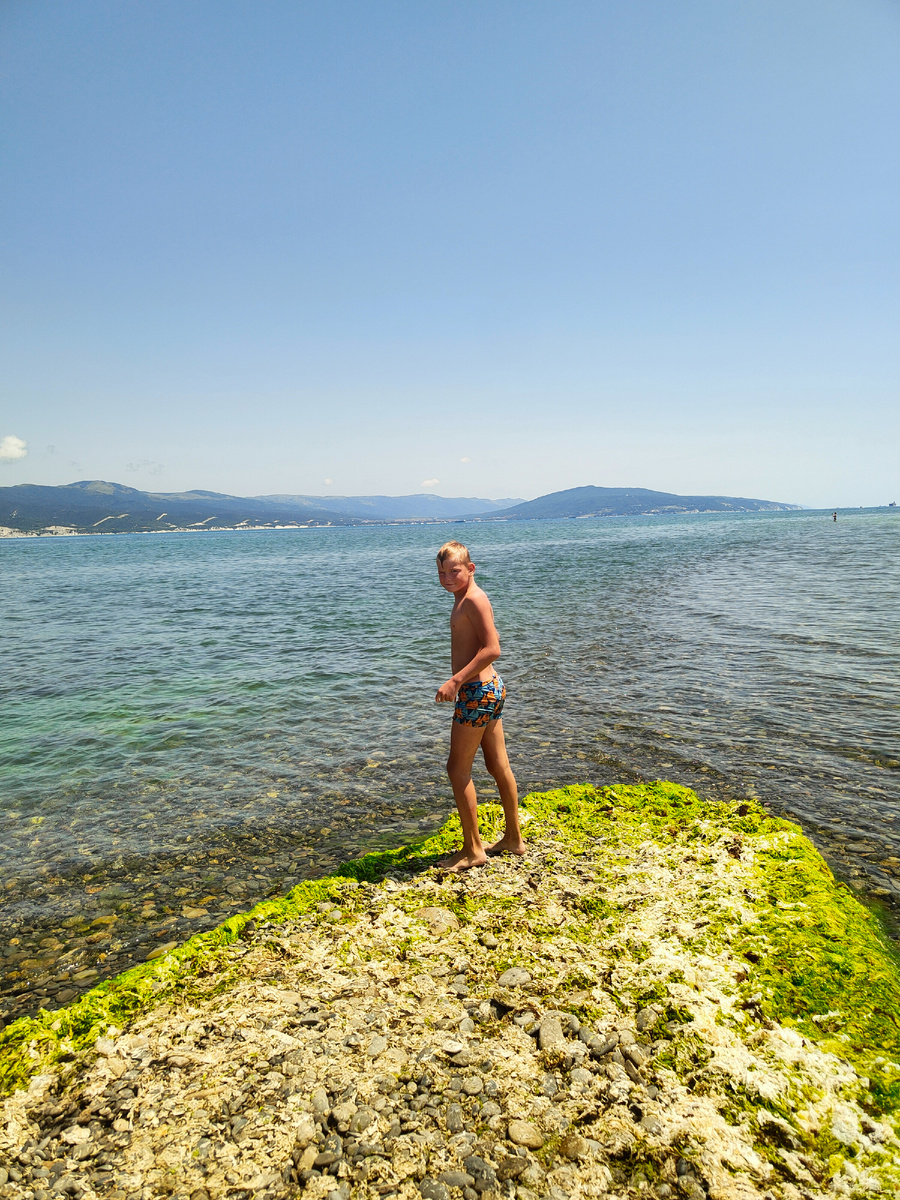 После магазина и небольшого перекуса мы пришли на центральный пляж Новороссийска. Выбрали чистое море среди крупных камней и совершили три интересных заплыва.