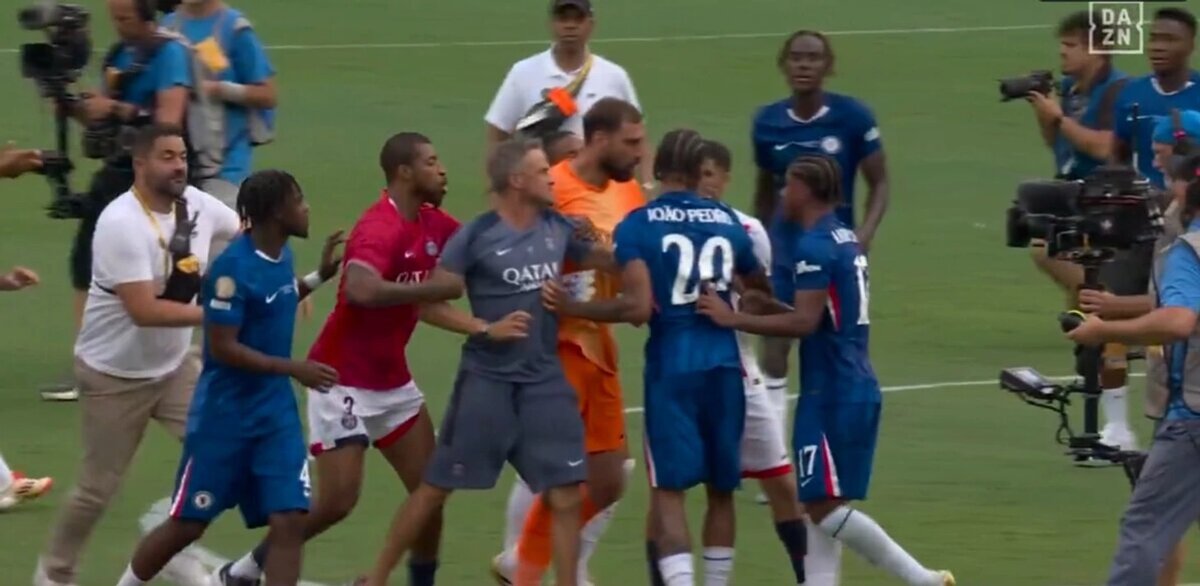 «Они не умеют проигрывать». У «ПСЖ» сдали нервы после разгрома от «Челси» (0:3) в финале клубного чемпионата мира. Жоау Невеш дернул Марка Кукурелью за волосы и получил красную, а Луис Энрике потом зачем-то вцепился в Жоао Педро. Энрике вскипел рядом с Педро – толкнул и попал в горло. Мареска пытался всех успокоить После свистка вдруг возникла потасовка. Тренер «ПСЖ» Луис Энрике толкнул новичка «Челси» Жоао Педро, он как раз довел до разгрома. Испанец попал рукой сперва в горло, а затем в лицо бразильцу. Жоао упал. «Я пошел защищать Андрея Сантоса, – рассказал потом Педро. – Видел, что игроки «ПСЖ» окружили его. Как истинный бразилец я пошел защищать товарища. Тут же оказалось сразу много народу, и в этой толпе меня толкнули. Это часть игры. Думаю, они не умеют проигрывать, но это часть футбола. А теперь пришло время праздновать». Активно участвовал в стычке и вратарь «ПСЖ» Джанлуиджи Доннарумма. Его пытался успокоить Энцо Мареска. Тренер тормозил и своих игроков, Кристофера Нкунку даж