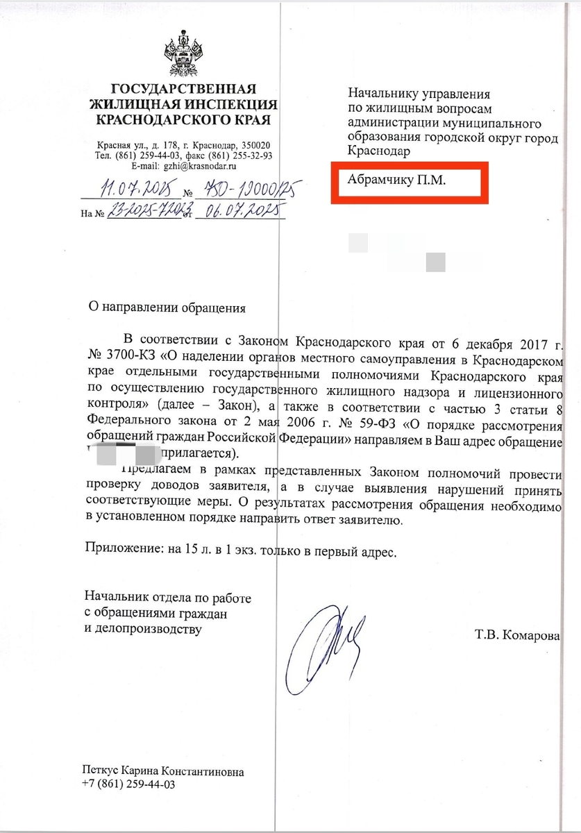 Между тем, согласно Закону Краснодарского края от 6 декабря 2017 года № 3700-КЗ «О наделении органов местного самоуправления в Краснодарском крае отдельными государственными полномочиями Краснодарского края по осуществлению государственного жилищного надзора и лицензионного контроля» (с изменениями на 11 июня 2025 года), Государственная жилищная инспекция (ГЖИ) в соответствии с действующим законодательством обязана осуществлять полный контроль за деятельностью Управления жилищно-коммунального хозяйства (УЖВ) администрации муниципального образования, включая контроль за рассмотрением направленных жалоб и обращений граждан.