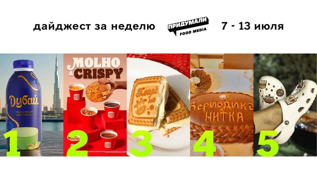 Традиционный дайджест за неделю в пяти постах 1️⃣ Фуд новинки со всего мира в подборке на этой неделе 2️⃣ Хрустящие «макательные» бургеры придумали в бразильском BURGER KING 3️⃣ Московский ресторан IF придумали десертные спешлы в виде самых простых вкусностей из детства 4️⃣ Коллаборация в семейном стиле в московской НИТКЕ совместно с ПЕРИОДИКОЙ 5️⃣ Свежая подборка креативного мерча от фуд брендов 👉подписаться на @pridumali #foodдайджест