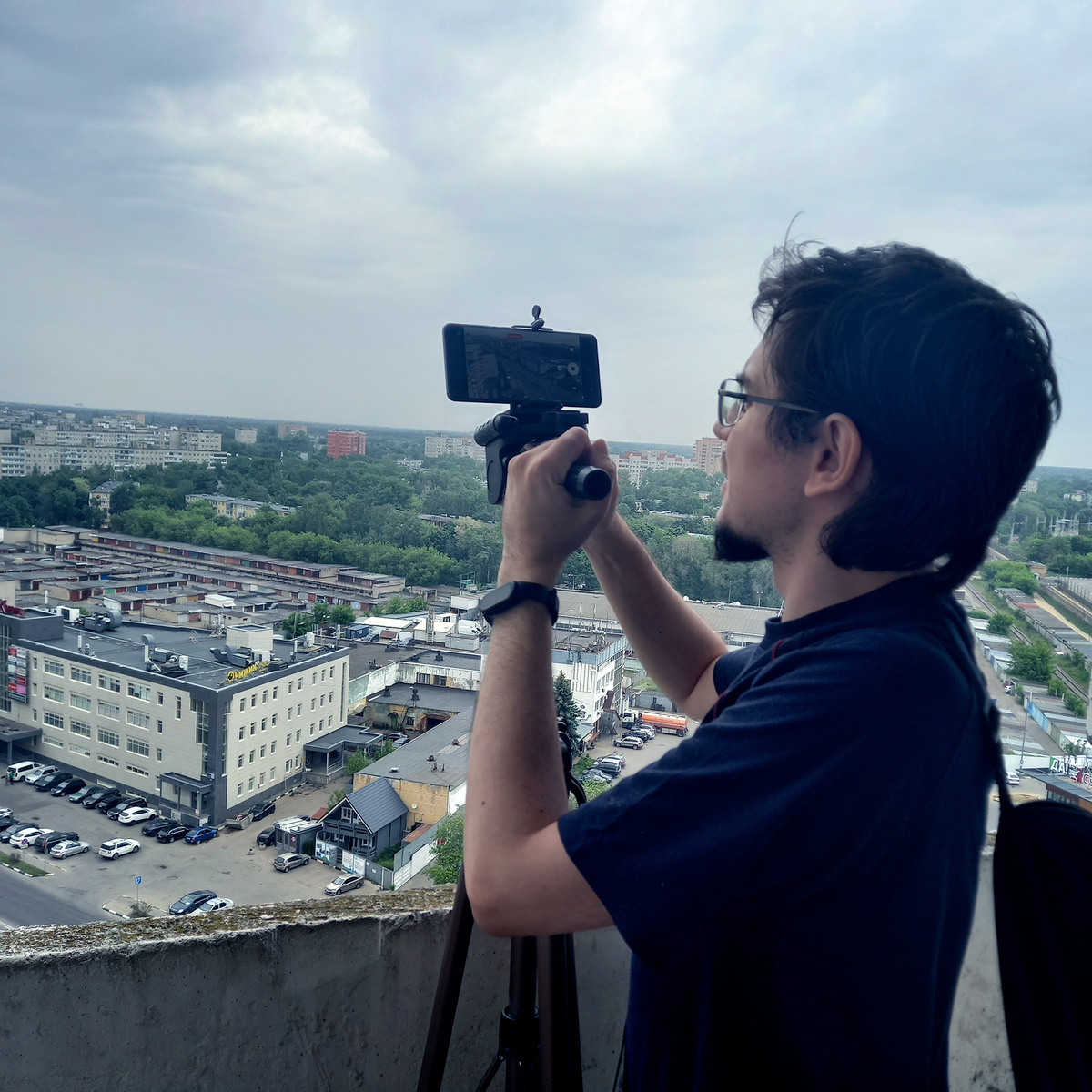 Третья часть саги о роботах от #ричардфильм “Называется “ГОЛОГРАФ”. Название смысловое. И история будет посвящена летающему роботу. Его мы уже показали в тизере в 2024 году. Но осталась масса вопросов: какие способности будут у робота? Будет ли он связан с робопсом или резиновыми телохранителями? Почему он весь утыкан лампочками? Зачем роботу кассовый аппарат? Как высоко он будет летять? Появится ли он в следующих фильмах? Все эти вопросы я как автор получаю, но, конечно же, не раскрываю интригу. Нужно ещё немного терпения, чтобы всё увидеть своими глазами. А пока делюсь фото с балкона семнадцатиэтажного дома. Мы снимаем красивые кадры с высоты птичьего полёта. С самого верхнего этажа башни. И да, отснятый материал нужен для историй про летающего робота. Не стоял вопрос, в каком городе снимать этот эпизод. Сразу же мы выбрали именно Жуковский — город людей, влюблённых в небо. Всё-таки в #ричардфильм частенько присутствует символизм. Очень уж мы его любим. И позволю себе приоткрыть ма
