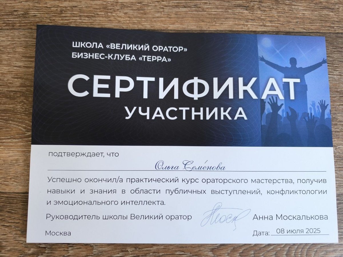 Я к вам с радостью, я получила сертификат в школе "Великий оратор",
