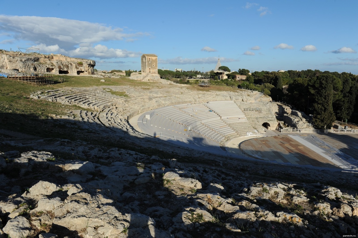 Форма амфитеатра в Сиракузах — круглая. Это заметное отличие от классических греческих театров, которые обычно имели полукруглую структуру. Круглая форма обеспечивала равномерный обзор с любой точки внутренней части здания и создавала замкнутое пространство для представлений. Такая архитектура хорошо подходила для организации боёв гладиаторов и зверей, где зрители окружали арену со всех сторон.