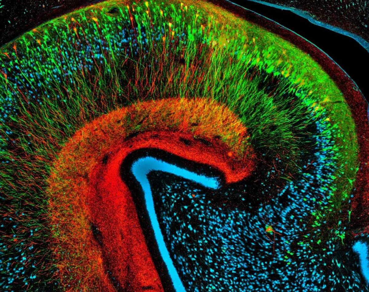 Победители конкурса NeuroArt: Срез гиппокампа мозга с моделью болезни Альцгеймера Здоровые нейроны покрашены в синий, а нейроны с разными таупатиями — неправильнно свернутым фосфорилированным тау-белком — в зелёный и красный Так что перед вами — несколько оттенков смерти нейронов, что коррелирует с ухудшением памяти, наблюдающимся у животного