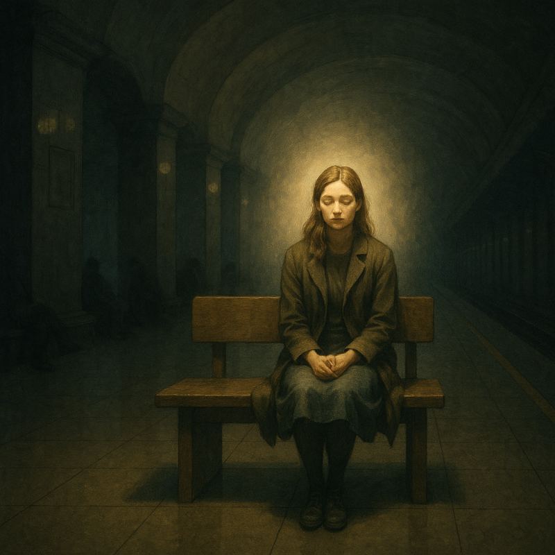 Он посмотрел по сторонам. Платформа была почти пустой. Кто-то читал, кто-то дремал, кто-то просто сидел. Ничего особенного. Только темновато и слишком тихо. Она сидела у колонны, ровно, спокойно, как будто просто ждала поезд. Как будто где-то у неё внутри оставался светлый кусочек времени, где тихо кипит чайник, где включён настольный светильник, и никто по ночам не прячется под землю. Он долго смотрел, потом решил пересесть ближе.