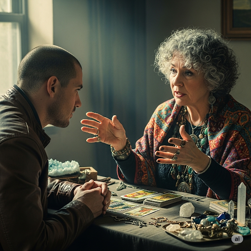 Мужчина, обращающийся к гадалке, ищет контроль и опору в условиях сильной неопределенности и тревоги. За этим стоит неуверенность в себе и готовность к иррациональному мышлению в кризис. Его "странности" включают скрытность в отношении суеверий, избирательную веру (когда он верит лишь тому, что хочет услышать), неосознанное подстраивание под предсказания (самосбывающиеся пророчества) и двойные стандарты, осуждая других за то, что делает сам.