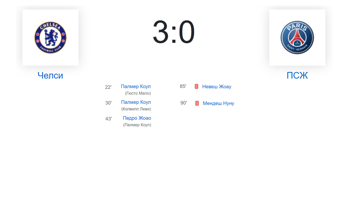 Привет всем. Завершился клубный чемпионат мира. Подводим итоги. Расскажу, кто стал чемпионом 2025 года лучшим бомбардиром и как распределились места с первого по 32-ое. Этой ночью (13 июля) прошёл финальный матч Клубного чемпионата мира между «ПСЖ» и «Челси». Победу с разгромным счётом одержал лондонский клуб. Уже на 22-й минуте «синих» вперёд вывел Коул Палмер, который отметился точным ударом с 15 метров, а через восемь минут он отличился вторым забитым мячом с передачи Леви Колвилла. На 43-й минуте игрок сборной Англии довёл счёт до разгромного (3:0).