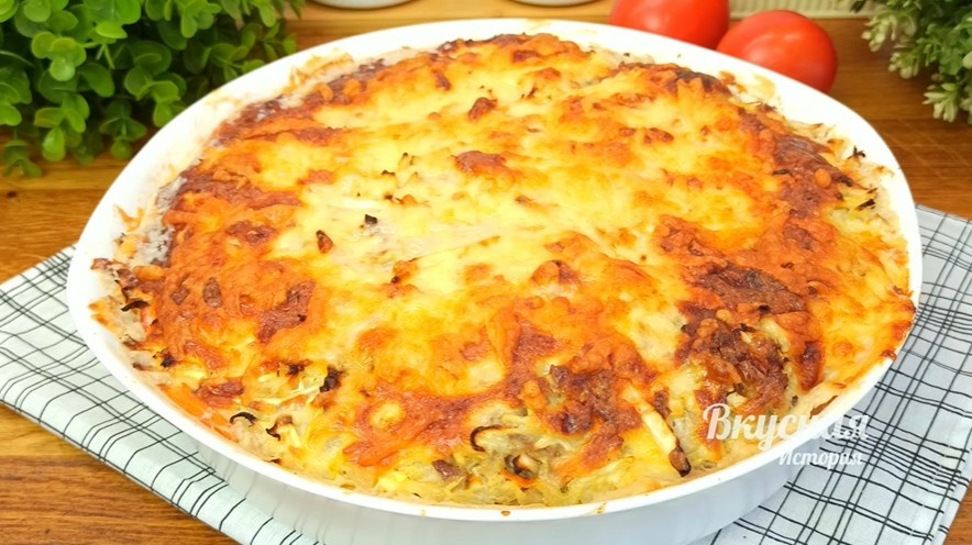 Всем здравствуйте. Сегодня приготовим очень вкусное и полезное блюдо на ужин. Готовится проще простого, а получается очень вкусно и полезно. Список ингредиентов вы найдете в конце⤵ ✅ Видеорецепт вы найдете в моем Телеграм канале по ссылке: https://t.me/vkusnayaistoriya Фарш кладу в миску, солю и перчу по вкусу. Добавляю 1 зубчик измельченного чеснока. Перемешиваю. В отдельную миску кладу нашинкованную капусту, немного солю и мну капусту руками. К капусте добавляю нарезанный репчатый лук и натертую на средней терке морковь. Перемешиваю. К овощам добавляю фарш и все хорошо перемешиваю. Форму для запекания смазываю растительным маслом. Выкладываю овощи с фаршем в форму. Готовлю заливку. В миску кладу 300 г сметаны, добавляю 1 зубчик измельченного чеснока. Солю и перчу по вкусу. Добавляю 3 яйца. Перемешиваю. Добавляю 150 г сыра натертого на терке. Перемешиваю. Получившейся заливкой, заливаем овощи с фаршем. Выпекаю примерно 1 час при температуре 180 градусов, но у меня большая форма D 28 с