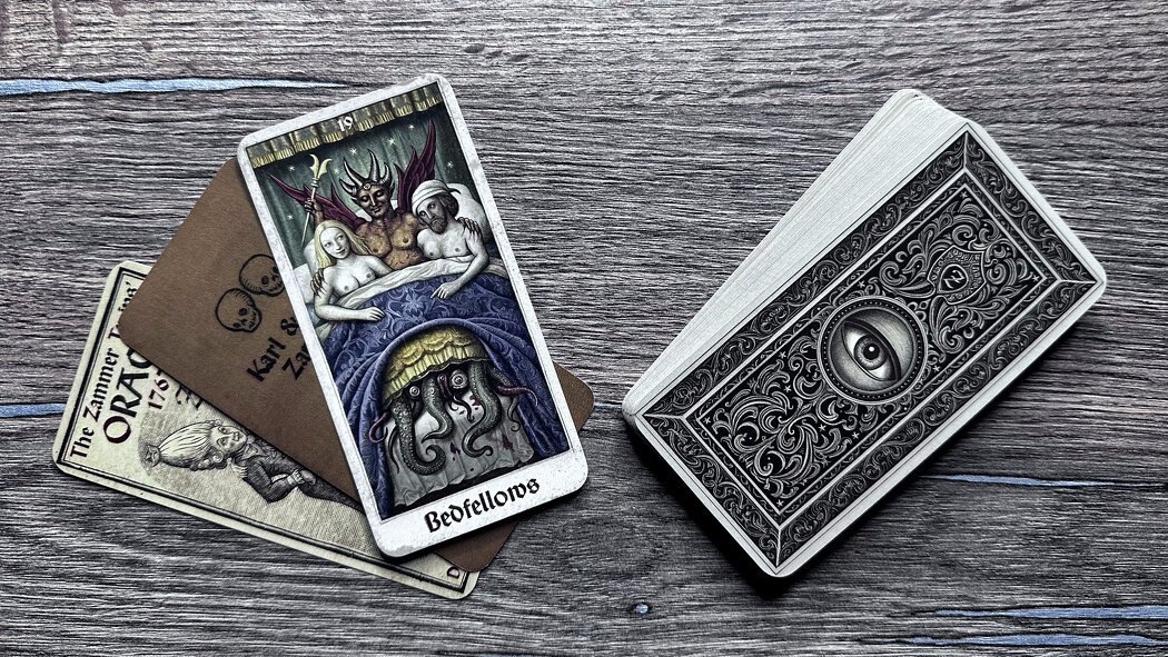 Карта №19, «Bedfellows», представляет собой сцену, нарушающую фундаментальные конвенции интимности. Вместо диады (пары) мы видим триаду: мужчина и женщина в одной кровати с доминирующей демонической фигурой между ними. Под покровом одеяла скрывается еще более регрессивный, хтонический уровень реальности — щупальца и немигающие глаза.