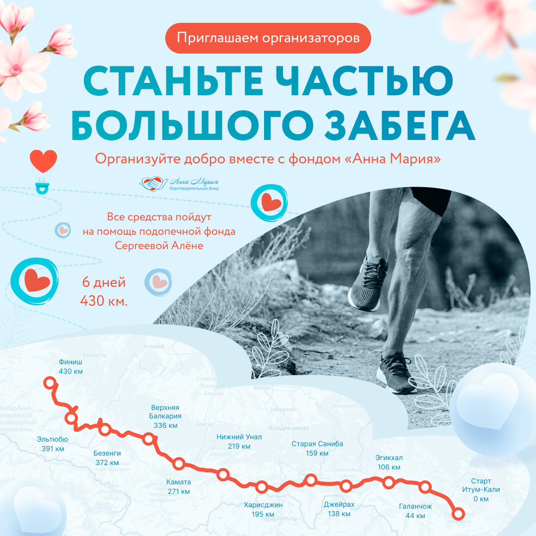 Приглашаем друзей, партнеров и благотворителей присоединиться к сбору средств в рамках организации и проведения марафона «Кавказ Ультра Трейл». Наша цель – собрать 5 миллионов рублей, чтобы частично покрыть расходы на лечение подопечной Сергеевой Алёны, которая борется с тяжелым диагнозом рак. Фонд «Анна Мария» принимает все варианты помощи от партнеров в рамках забега. Если у вас нет возможности сделать денежное пожертвование, вы можете поддержать нас другим способом – выдать купон, талон, ваучер или сертификат на свою продукцию, предоставить скидки на услуги и работы, оказать помощь в натуральной форме (подарить книги, канцтовары, технику, любые вещи), поддержать информационно. Мы предлагаем также купить благотворительный сертификат на любую сумму для себя или на подарок. Все средства будут направлены на покрытие расходов, связанных с лечением Сергеевой Алёны. Продукцию, которую вы пожертвуете, мы разыграем среди подписчиков ВКонтакте. Итоги сбора, сумму призового фонда и результаты