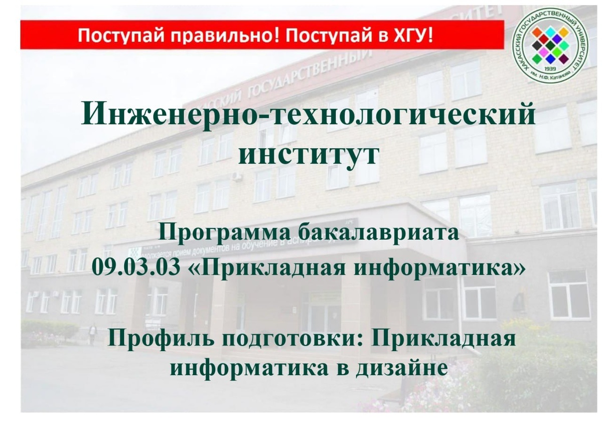🔥В ХГУ продолжается «Приёмная кампания–2025» В период горячей поры для абитуриентов и родителей ежедневно в социальных сетях вуза будем рассказывать о востребованных направлениях подготовки в институтах и колледжах💬 Инженерно-технологический институт: «Прикладная информатика» (профиль: Прикладная информатика в дизайне) О вступительных испытаниях, баллах ЕГЭ, индивидуальных достижениях здесь Квалификация: бакалавр Форма обучения: очная Срок обучения: 4 года Бюджетных мест: 37 ❓Кем можно работать: - руководителем дизайн студии или рекламного агентства - системным администратором - программистом - информационным аналитиком - руководителем отдела разработок прикладного ПО - дизайнер-разработчиком веб-сайтов Интересное об ИТИ ✔️За 25 лет ИТИ подготовил более 3500 выпускников. ✔️Выпускники ИТИ работают в 7 странах мира: ОАЭ, Австралии, Бельгии, Германии, Канаде, Монголии, Чехии. 📲Телефон приемной комиссии: 8 (3902) 22-37-73 📍г. Абакан, пр. Ленина 90, каб. 101 🌐Подать заявление
