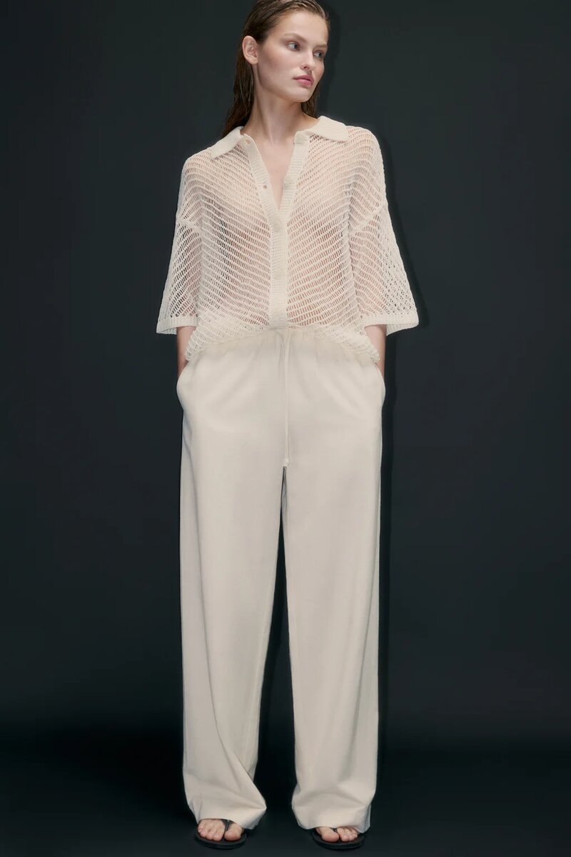 Ажурные брюки на завязках из 100 % хлопка, полупрозрачность в тренде, ажурный материал тоже и с натуральным составом будет не жарко. Брюки имеют свободный крой, среднюю посаду и тонкий эластичный пояс-резинку на завязках. Укороченная подкладка прикроет то, что надо прикрыть, оставляя, по сути, ноги голыми.