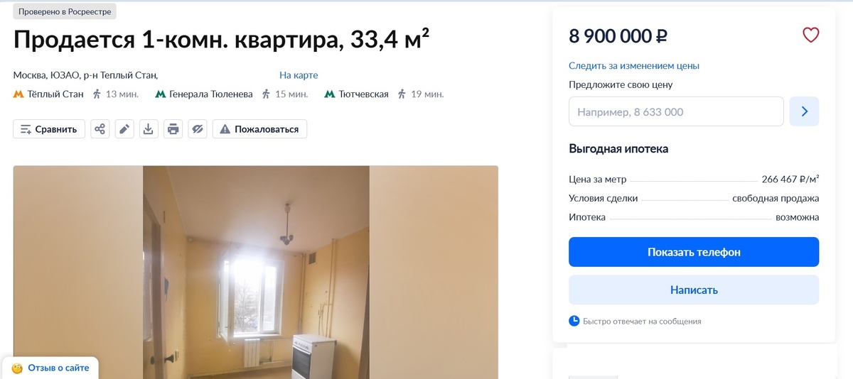Давненько я не смотрел, что происходит на “дне рынка” с однушками. Условия прежние - не первый этаж, внутри МКАД, дома от 9 этажей, разумное расстояние пешком от метро. Обычная квартира, планировке в рекламе нет, про документы ничего, но стоимость в договоре полная. Это хорошо. Фото на телефон, скромненько, но атмосферу передают. :) Два-три месяца назад квартиры там были подешевле, но сейчас район 9 млн не выглядит дорого. Мне это место не нравится, но и не только мне. По цене, повторюсь, это лидер дно рынке в ЮЗАО. За 8,5 квартиру возьмут быстро, за 8,9 повисит :). Цена для это места нормальная. Возможно документы не очень хороши…. Звонки покупателей будут приходить к пяти разным людям, а не к одному и понять уровень спроса невозможно, отсюда и невозможно понять реальную стоимость квартиры. Я помню когда появилась эта квартира, она стоила тысяч на 500 дороже, ожидаемо начала дешеветь и даже при это некоторым участникам “гонки на понижение” лень следить за ценой и снижать ее. У них она