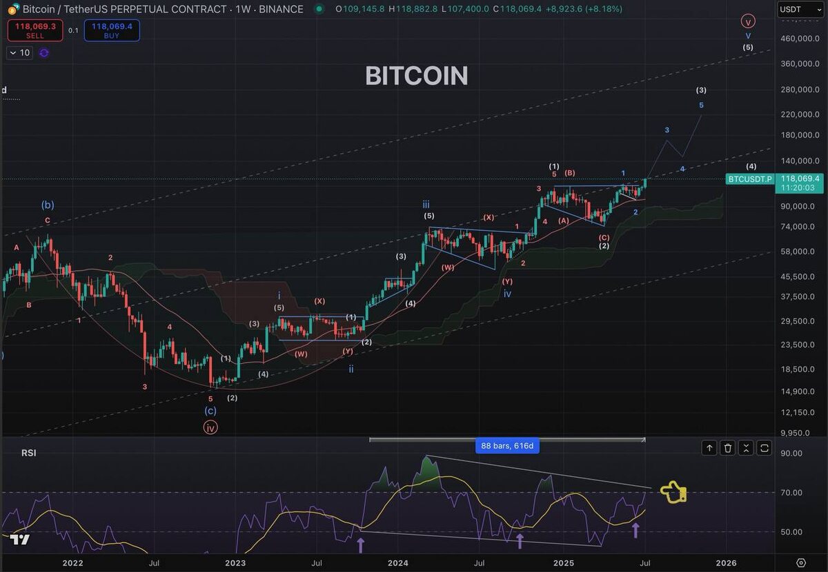 Это ещё только волна 3. Основной удар — впереди Если смотреть на график с позиции волновой теории Эллиотта — мы как раз вошли в третью волну третьей волны. Самую мощную фазу бычьего цикла. Текущий рост выглядит как разметка (1)-(2), а значит, впереди импульс (3)-(4)-(5), который может унести цену BTC в диапазон $200–300К, если канал удержится. Теперь посмотрим ниже, на RSI. Индикатор снова протестировал нисходящую трендовую линию, как это было дважды раньше — и снова от неё отскочил вверх. Сигнал силы. О чём это говорит? — Структура продолжает разворачиваться вверх — RSI показывает отсутствие перегретости — Импульс ещё не разыгран до конца Сильнейший момент — совпадение по таймингу: от марта 2023 до июля 2025 прошло 616 дней, как и от дна прошлого цикла до точки мощного ускорения. История не повторяется, но рифмуется. Вывод: Текущий рост может быть всего лишь прелюдией к основному движению. Но откаты по ходу будут — и они важны. Именно в них и происходит настоящий набор. Хотите