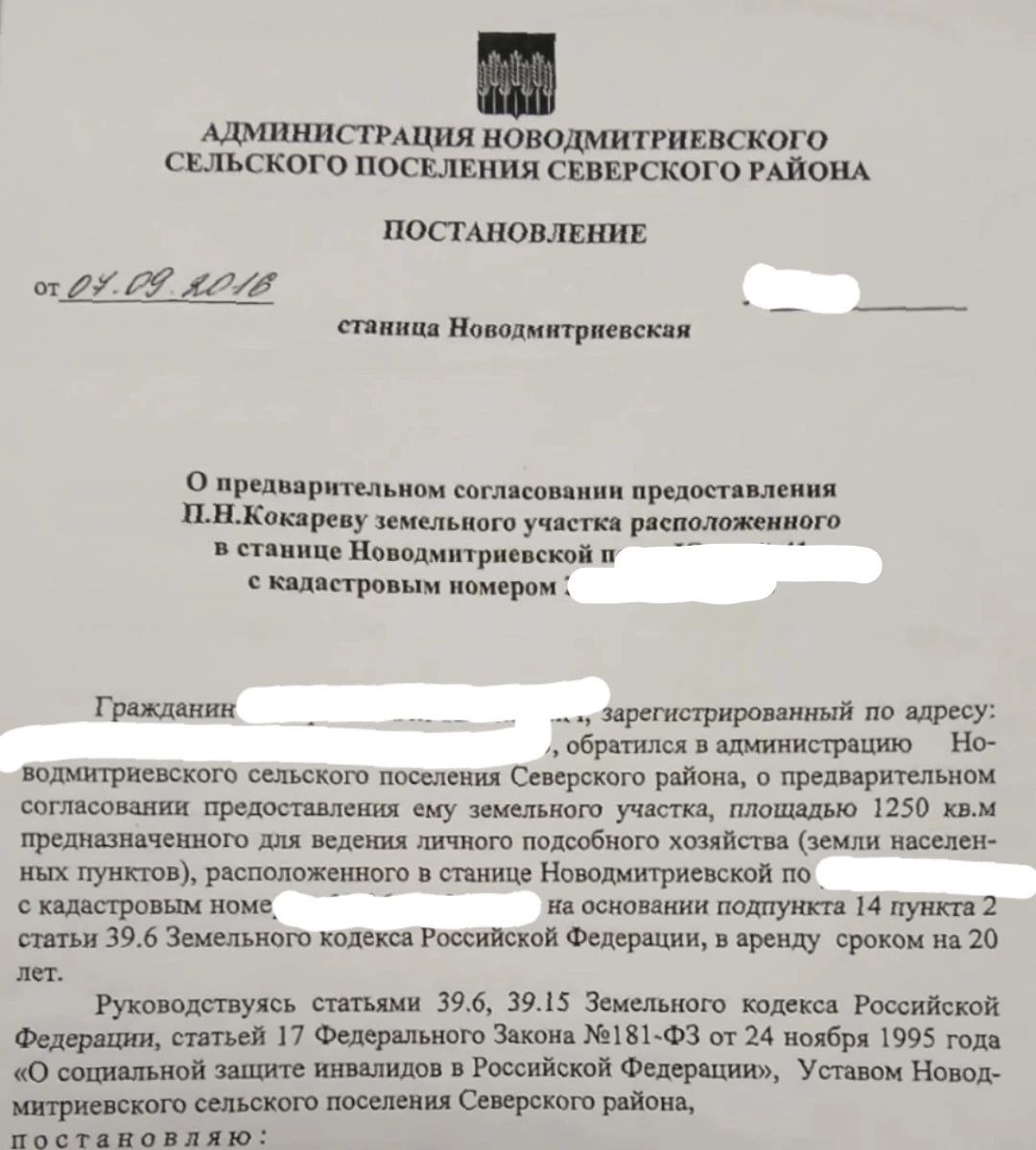 История клиента. 🤝 К нам обратился Василий (имя изменено). Он хотел приобрести земельный участок, но до сделать решил убедиться, что ничем не рискует. Василий записался к нам на консультацию, чтобы это выяснить. Когда мы взялись за дело, обнаружилось, что разрешение на строительство ему мне дадут и в собственность его он не оформит. Потому что выдача участка была в рамках улучшения жилищных условий особой категории граждан. 👩🎓 А теперь человеческим языком)))) 👇 В 2016 году по обращению гражданина с инвалидностью администрация станицы Новодмитриевской выделила ему в аренду земельный участок сроком на 20 лет с применением ст. 17 ФЗ №181 для улучшения жилищных условий инвалидов. Такие участки выдаются конкретному лицу в качестве помощи и не могут быть переданы третьим лицам, вообще говоря. Однако с того момента участок уже дважды😲 переходил к новым арендаторам по переуступке права. Да, это было незаконно!🤦♀️ но тем не менее, право перешло. И это уже совсем другая история. Но ☝️ по