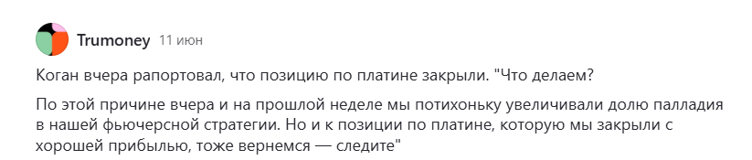 мне читатель ответил комментарием, что "широко известный в узких кругах самоназванный финансист" Евгений Коган закрыл позицию по платине.