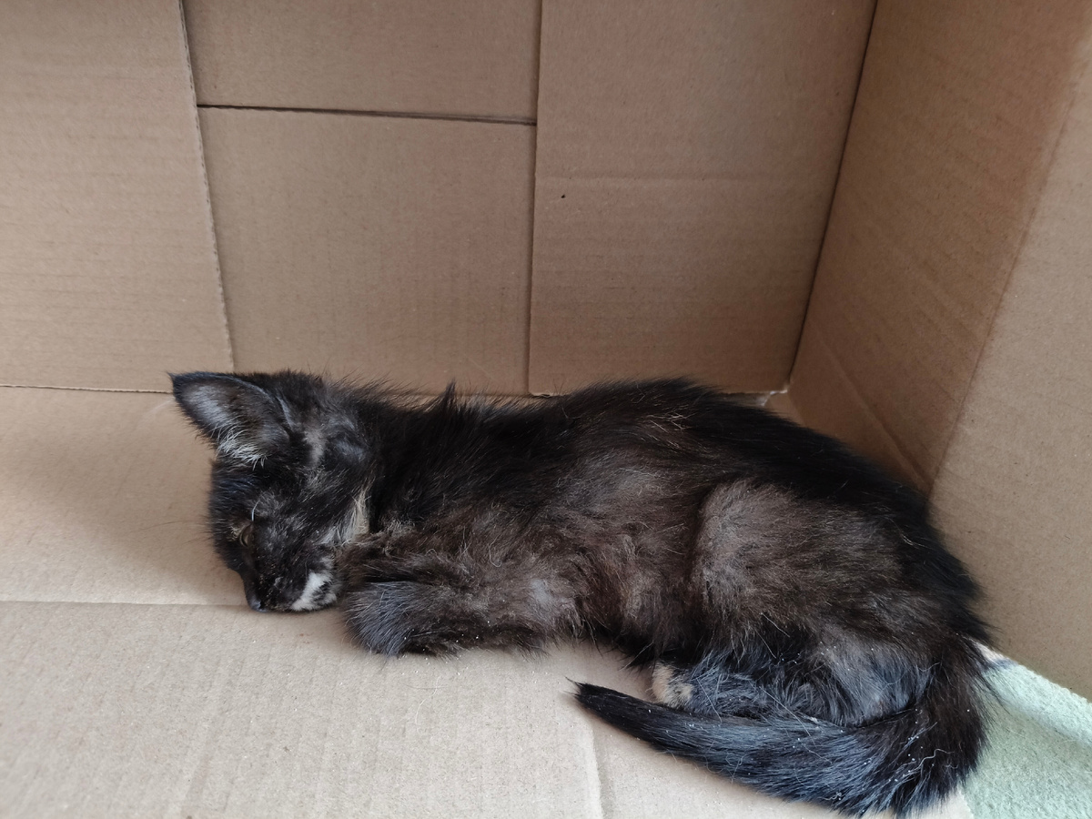 На тротуаре издалека я увидела что-то тёмное. Я не очень хорошо вижу, там ещё голуби паслись рядом, поэтому я и подумала - черный голубь отдыхает. На солнце греется. Подойдя ближе, обнаружила котенка. Он лежал не в той позе, в какой обычно отдыхают кошки. Подняла его - как тряпочка. Тряпочка, кишащая блохами.