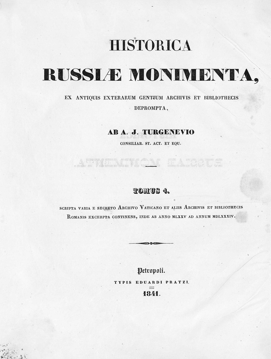 В 30-40-е гг. XIX века историк и публицист Александр Иванович Тургенев собирал в европейских хранилищах документы, касающиеся истории России и других государств Восточной Европы XI-XVIII веков. Он работал в Ватикане, римских, французских и английских архивах и библиотеках. В 1841-1842 гг. по распоряжению императора Николая I подготовленные им материалы были изданы Археографической комиссией в двух томах с дополнениями. Двухтомник вошел в историческую науку под названием “Акты исторические, относящиеся к России, извлеченные из иностранных архивов и библиотек А.И. Тургеневым”. В первом томе опубликованы документы, охватывающие период с 1075 по 1584 гг., во втором – с 1231 по 1719 гг. В “Актах” напечатаны документы, посвященные русско-польским и русско-английским отношениям XVI в., событиям Смутного времени, присоединению Украины к России, пребыванию Петра I во Франции.