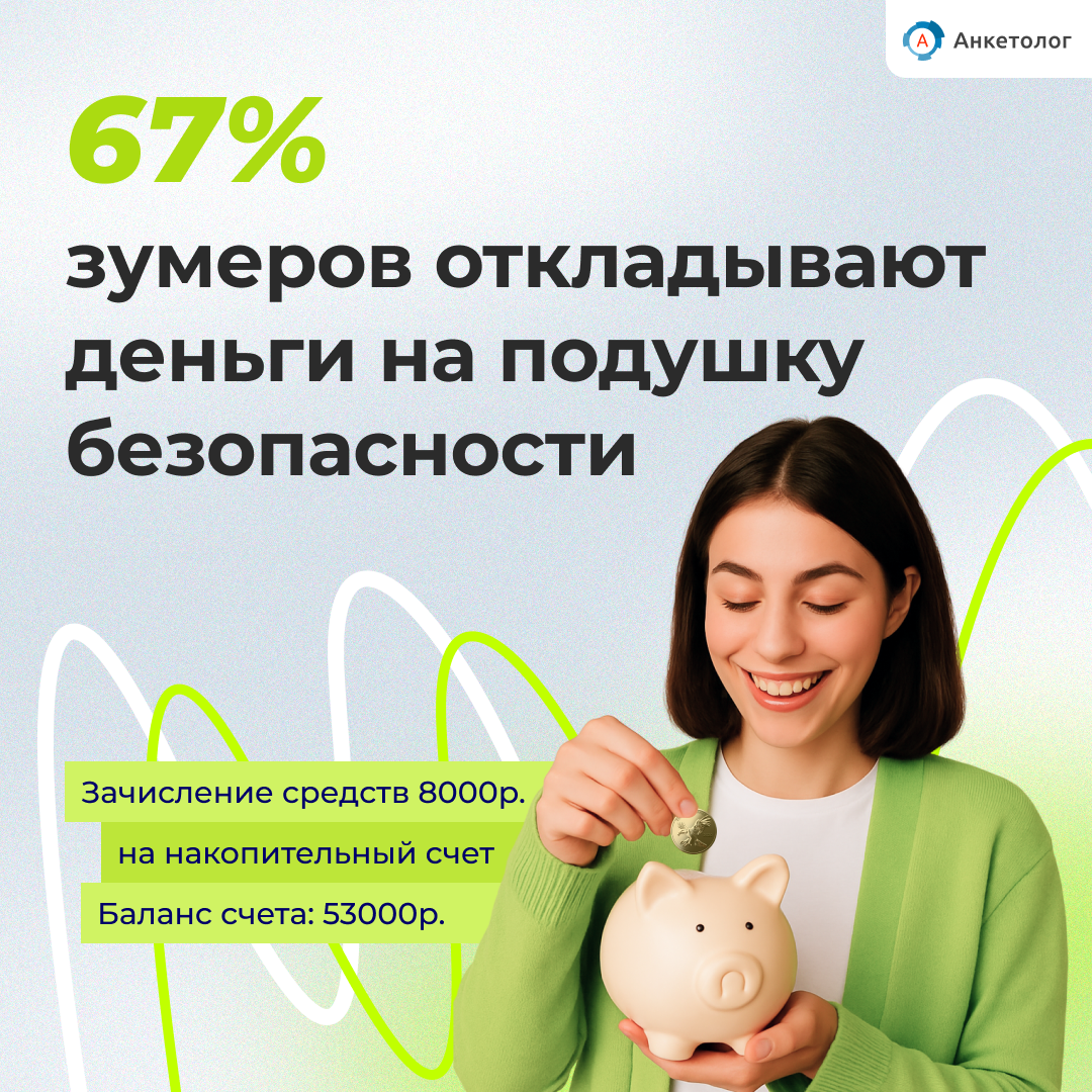 Мы провели исследование среди 1500 зумеров (18-28 лет) по всей России, чтобы понять, как это поколение управляет своими финансами. Оказалось, что 67% опрошенных регулярно откладывают деньги, 48% делают это время от времени. Респонденты назвали разные цели для накоплений: от создания подушки безопасности до покупки техники и крупного имущества. Половина опрошенных (50%) зумеров регулярно откладывает часть своих доходов, а еще 48% делают это время от времени. Среди тех, кто копит деньги, почти треть (32%) планирует откладывать их на срок до года, другая треть (31%) — на неопределенный срок. 20% зумеров откладывают средства на период от недели до месяца, а 12% — на срок от 1 до 3 лет. Зумеры откладывают деньги на различные цели, и вот самые популярные из них: Самыми популярными способами накоплений среди зумеров являются накопительные счета (63%), банковские вклады (52%) и наличные (46%). Также 15% используют акции и облигации, 7% инвестируют в недвижимость и криптовалюту, а 5% предпочита