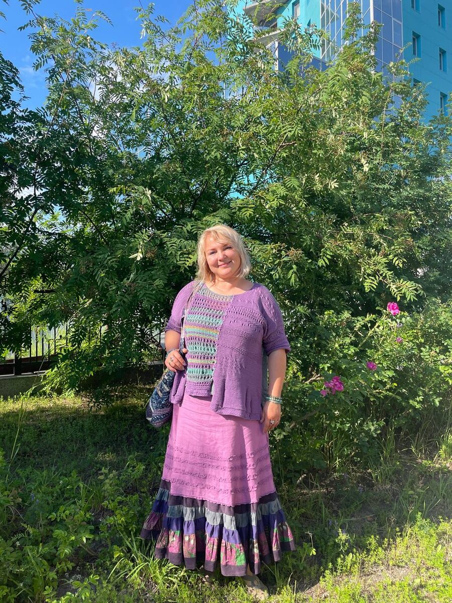 Эту вязаную кофту я уже представляла здесь, и, наконец, в лето собрала её в ансамбль с юбкой, сшитой несколько лет назад. Точнее, юбка была покупная, но я дополнила её воланом, собранным из вторсырья, как говорится: рубашек и остатков ткани от прошлых проектов. Сумка, кстати, тоже давняя лоскутная история)) Второй ансамбль - в зелёных оттенках. Куртку шила когда-то, вдохновившись творчеством Евдокия Прохоровой. Юбку фабричную по обыкновению дополнила воланом. А зеленая, связаная из хлопка футболка, вышла в свет буквально вчера. Решила поучаствовать в совместнике у одной замечательной мастерицы, но увлеклась и пошла своим путем. Поняла, что не хватает мне чаще всего терпения внимать в описания и узоры, хотя, казалось бы, все расписано, вникни, сиди и вяжи... В общем, вязала, импровизируя по ходу пьесы. Результат радует. Всем вдохновения!