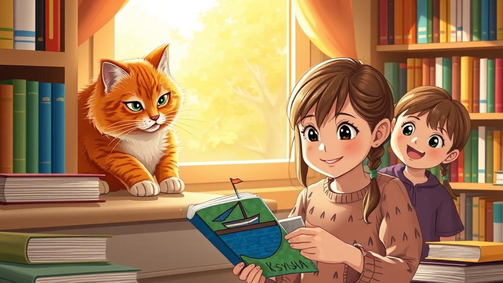 Персик и таинственная закладка В библиотеке после уроков пахло чуть влажной бумагой и чем-то сладким — будто мармелад случайно спрятался между страницами. Ксюша неспешно скользила взглядом по полкам в поисках книги про диковинные острова. Старый диванчик под окном манил устроиться поудобнее — здесь всегда было чуть спокойнее, чем во всем классе. На подоконнике свернулся пушистый кот Персик — он любил библиотеку почти сильнее, чем валерьяновые игрушки. Ксюша тихонько села на край дивана, чтобы не потревожить усатого читателя. — Привет, — прошептала она, чтобы не спугнуть тишину. Персик моргнул и повернул голову к стопке книг рядом. Из одной книги между страниц выглядывал уголок яркой бумаги. Ксюша осторожно вытянула книжку и развернула находку: это оказалась самодельная закладка с нарисованной синей лодочкой и надписью неровными детскими буквами — «Не открывай до пятого урока!» Ксюша нахмурилась — у неё как раз закончился четвёртый урок. — Интересно, чей это секрет? — пробормотала