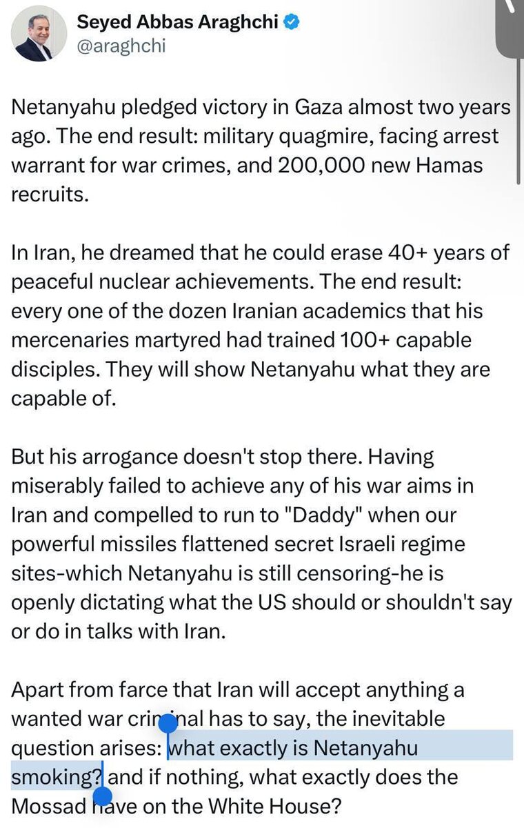 🇮🇷🇮🇱 Глава МИД Ирана Аббас Арагчи: «Нетаньяху обещал победу в Газе почти два года назад. Результат: военная трясина, угроза ареста за военные преступления и 200 000 новых рекрутов ХАМАС. В Иране он мечтал стереть более 40 лет достижений в области мирной ядерной энергетики. В результате каждый из дюжины иранских учёных, убитых его наёмниками, подготовил более сотни способных учеников. Они покажут Нетаньяху на что они способны. Но его высокомерие на этом не заканчивается. Потерпев сокрушительную неудачу в достижении своих военных целей в Иране и будучи вынужденным бежать к «папочке», когда наши мощные ракеты уничтожили секретные объекты израильского режима (которые Нетаньяху до сих пор цензурирует), он открыто диктует, что США следует или не следует говорить и делать на переговорах с Ираном. Помимо фарса о том, что Иран поверит всему, что скажет разыскиваемый военный преступник, возникает неизбежный вопрос: что именно курит Нетаньяху? И если ничего, то что именно есть у Моссада н