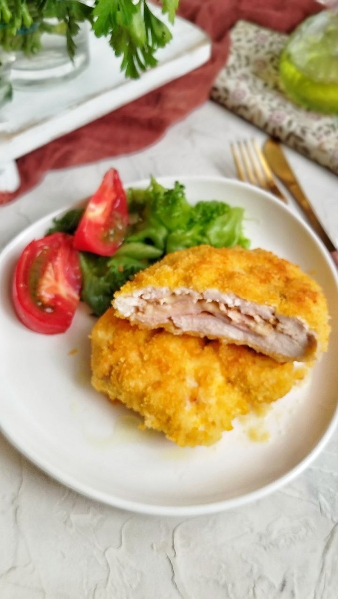 Кордон блю из куриной грудки или как приготовить куриную грудку так, чтобы она была вкусная, сочная внутри и при этом хрустящая снаружи. Да, вариант не самый простой, далеко не зожный и не пп, но гарантирую, что это будет самая вкусная куриная грудка. Для приготовления 2 порций нам понадобится : Куриные грудки 2 шт. Сыр слайсами, у меня Маасдам 2 шт Ветчина слайсами 2 шт. Соль по вкусу Специи по вкусу (у меня так и называется Для курицы) Растительное масло 20 мл Сливочное масло 10 г Для панировки: Мука 50 г Яйца 2 шт. Панировочные сухари панко 30 г Куриную грудку надрезать вдоль и раскрыть. Положить на пергамент, накрыть пергаментом и отбить. Курицу посолить и посыпать специями. На одну половину филе положить ветчину, сыр и ещё раз повторить слои. Накрыть второй половиной филе и обвалять сначала в муке, потом в яйце и затем в панировочных сухарях. На сковороде разогреть растительное масло, добавить сливочное масло и обжарить куриное филе по 3-4 минуты с каждой стороны до зол