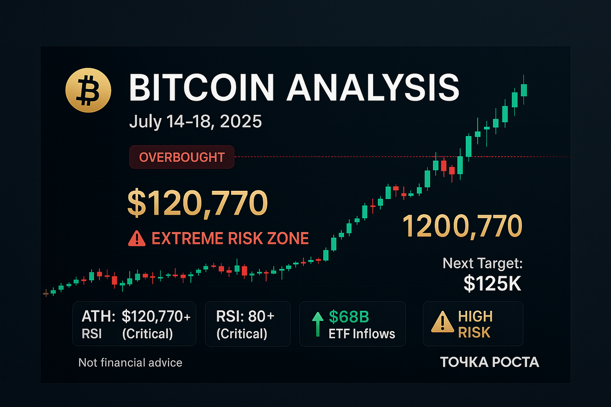 Bitcoin достигает исторических максимумов на фоне институционального спроса, но технические индикаторы сигнализируют о необходимости осторожности. Криптовалюта торгуется в диапазоне $117,800-$120,930, установив новый рекорд $120,930 на Coinbase 14 июля. Массивные притоки в ETF ($68 млрд в 2025 году) и создание Стратегического резерва биткоина США создают структурно бычий фундамент, однако перекупленность по RSI (73.4) и геополитические риски требуют тактической осторожности.