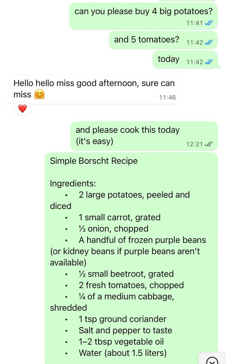 нарезала няне задания хочу доверить ей варку борща))) в этом году я ставила себе цель делегировать всю бытовуху, включая готовку, иду маленькими шагами к этому🤩 боже как прекрасно это разгрузит мне руки p.s. просто написала gpt состав на нашу кастрюлю и попросила написать рецепт на англ 5 минут заняло интересно какой будет результат